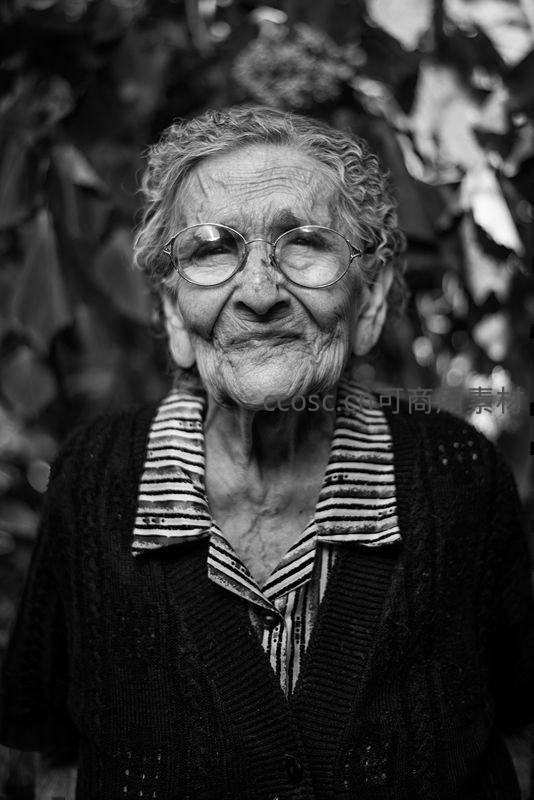 一位戴着眼镜的老奶奶面带微笑,黑白影像突显了她脸上的每一道皱纹,仿佛在诉说着漫长而温暖的人生故事。