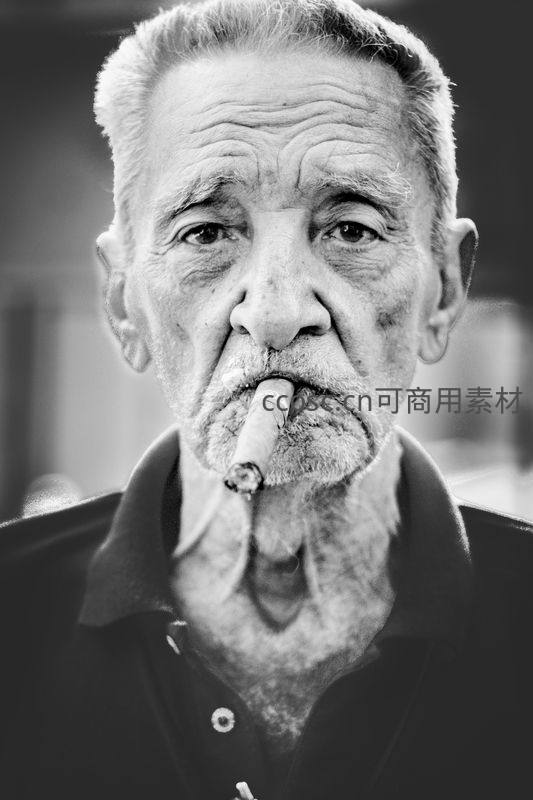 一位饱经风霜的老人叼着香烟,目光深邃,面部沟壑纵横,黑白影像强化了其经历与个性,传递出无声的故事感。