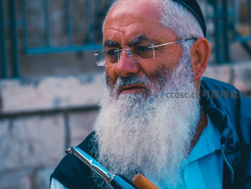 一位留着浓密白胡须的长者,戴着眼镜与传统小帽,眼神深邃而专注,仿佛在思索人生或信仰,背景略显模糊突出人物神态。