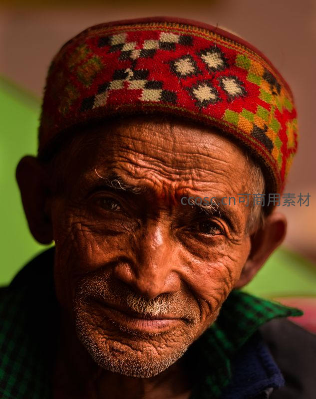 一位面带温暖笑容的年长者,脸上布满岁月痕迹,头戴色彩斑斓的传统针织帽,眼神温柔,展现出历经沧桑后的从容与喜悦。