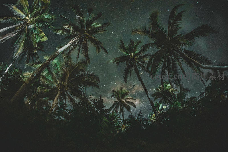 在热带雨林的怀抱中,高耸的椰子树剪影与璀璨的银河交相辉映,营造出如梦似幻的静谧夜景。