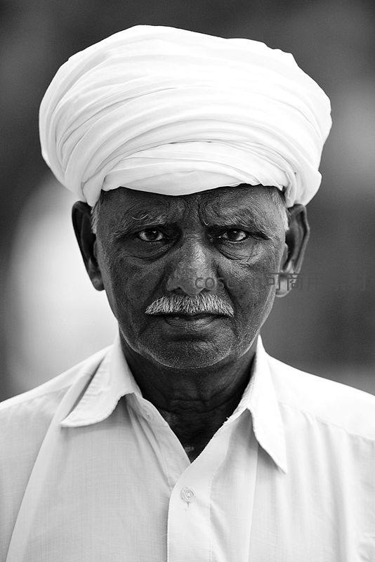一位身着白色传统服饰、头戴白巾的老人正视镜头,面容刚毅而沉静,黑白画面突出其文化身份与岁月沉淀。