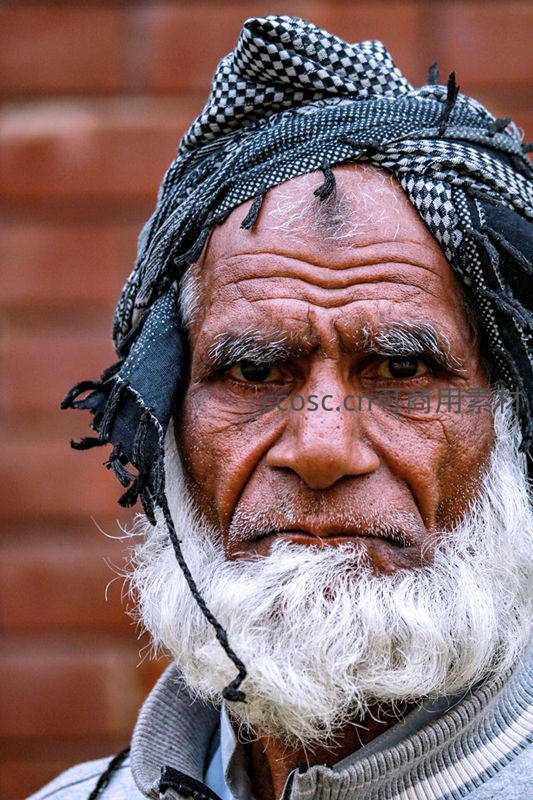 一位饱经风霜的老人戴着黑白格纹头巾,浓密白须与深邃眼神诉说着岁月故事,背景红砖墙更添厚重历史感。