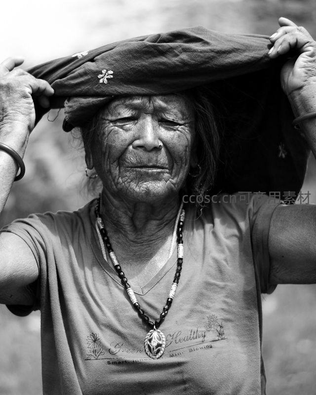黑白画面捕捉一位老年女性用布遮阳的瞬间,面部皱纹深刻,佩戴传统项链,流露出质朴而坚韧的生命力量。