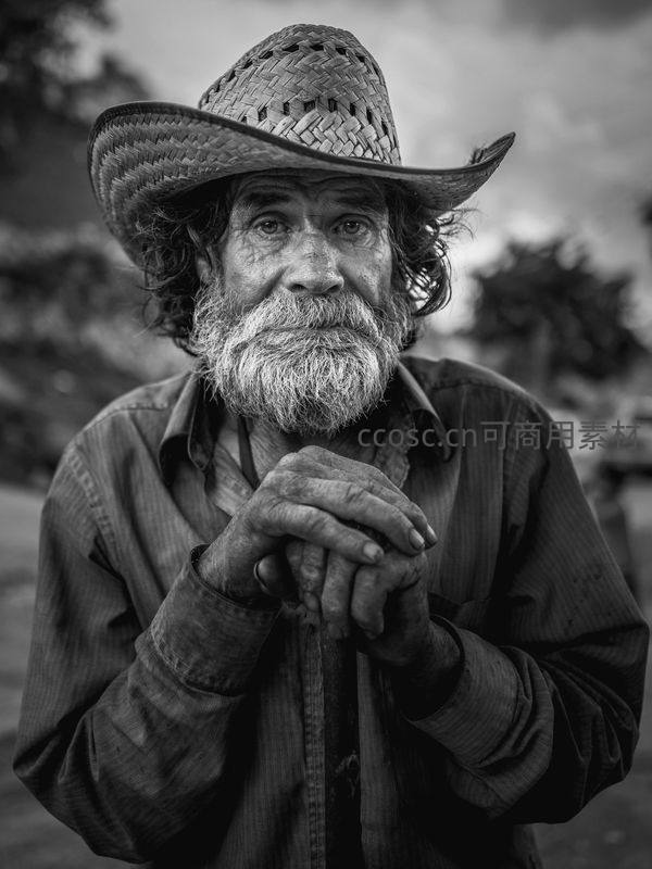 一位戴着编织草帽的年长男性,面容布满风霜与皱纹,双手交握于胸前,眼神深邃而平静,仿佛在诉说一生的故事。