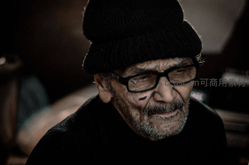 一位戴着黑色针织帽和眼镜的老者,侧脸特写,嘴角微扬,脸上刻着时光的印记,眼神中流露出温和与智慧。
