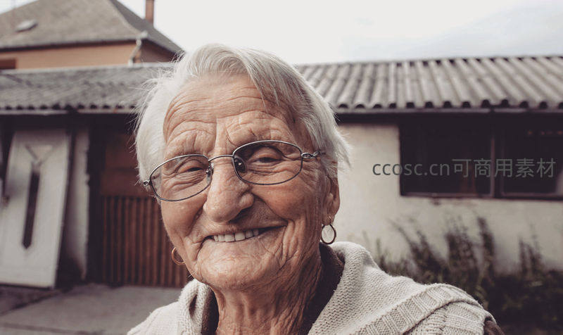 一位白发苍苍的老奶奶,戴着细框眼镜,对着镜头绽放出灿烂的笑容,背景是质朴的房屋,传递出满满的幸福感。