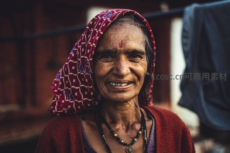 一位戴着花纹头巾的老年女性,面带亲切笑容直视镜头,额头中央有红色装饰点,颈挂串珠项链,展现出独特的文化韵味。