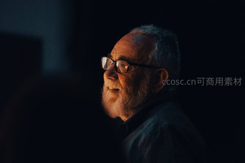 在昏暗背景中,一位白发长须的老者侧身而立,眼镜反射微光,嘴角含笑,仿佛正沉浸在一段回忆或深邃的思考中。