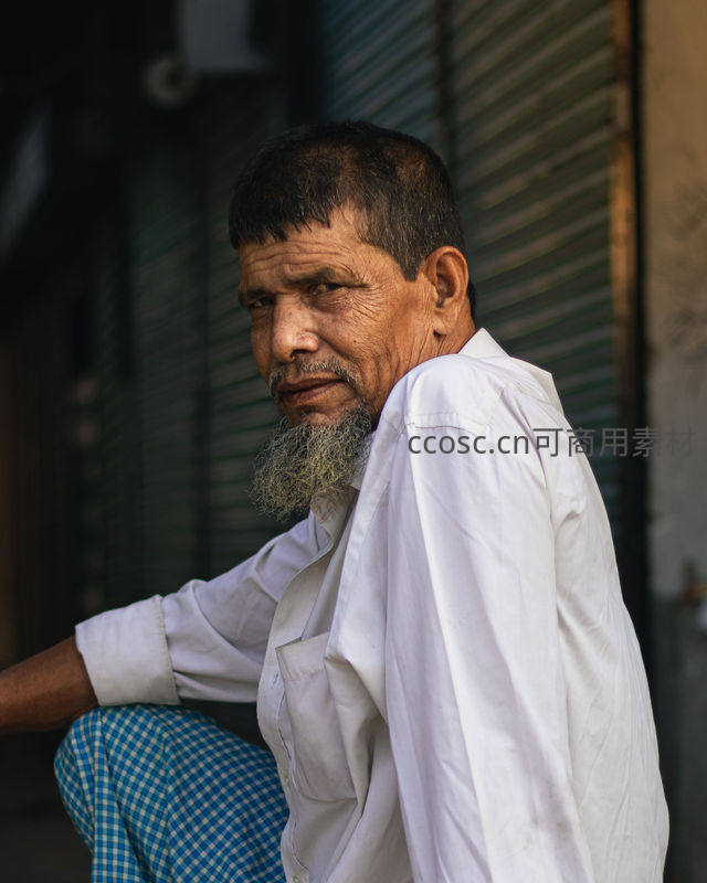 一名留有胡须的中年男子坐在街边,身着白衬衫蓝格裤,侧脸望向远方,神情若有所思,展现市井生活的瞬间。