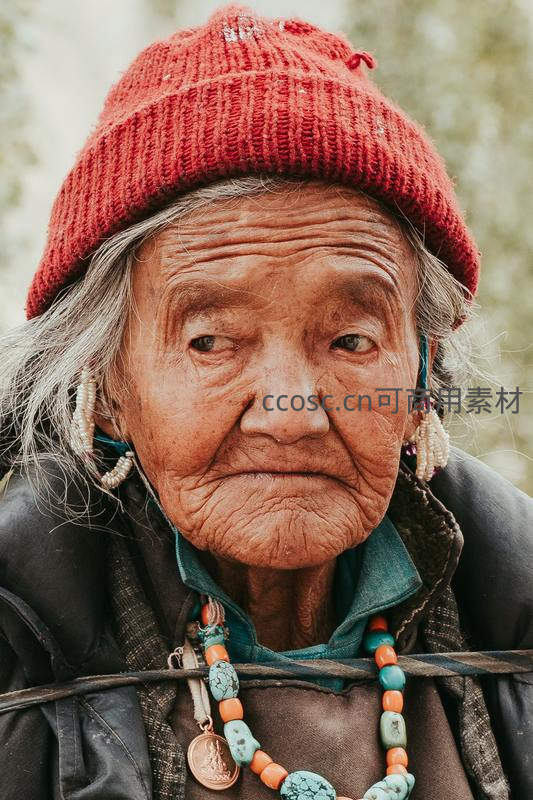 一位戴着鲜艳红色针织帽的老年女性,面部皱纹深刻,佩戴着传统珠串项链和耳饰,神情宁静而深邃,充满生活阅历。