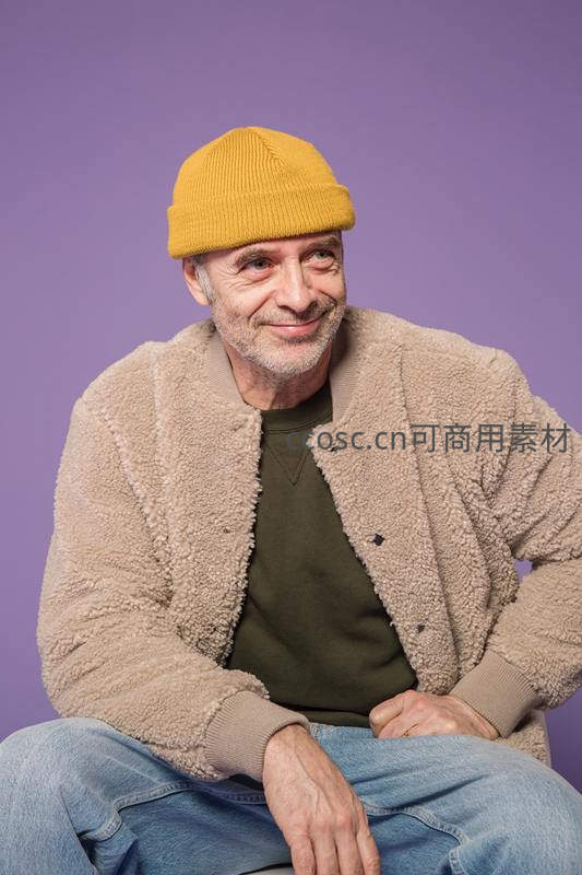 一位面带温暖微笑的成熟男士,头戴黄色针织帽,身穿米色绒毛外套和牛仔裤,姿态放松,展现出从容自信的生活态度。