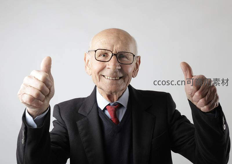 一位戴着眼镜、穿着西装的年长男士面带微笑,双手竖起大拇指,传递出肯定、支持与喜悦的情感,充满正能量和亲和力。
