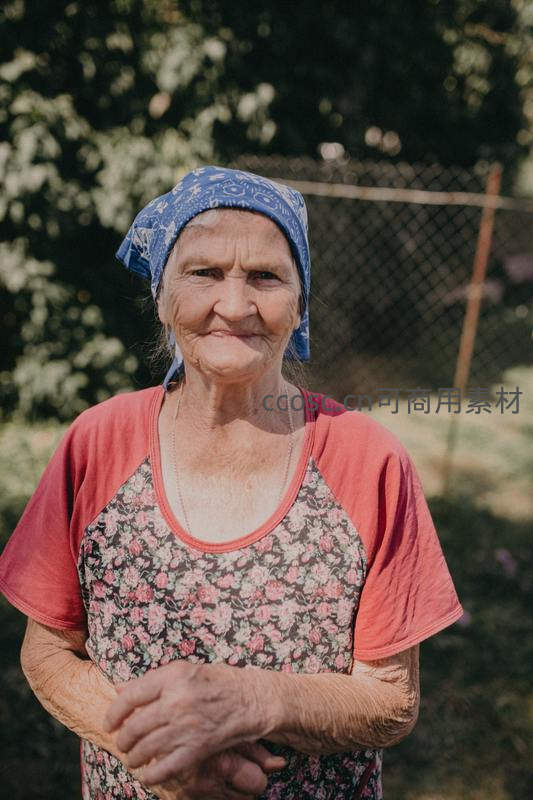 一位头戴蓝色花头巾的老妇人站在户外绿植前,身穿碎花上衣,双手交叠于胸前,面带温和微笑,展现出宁静安详的田园生活氛围。