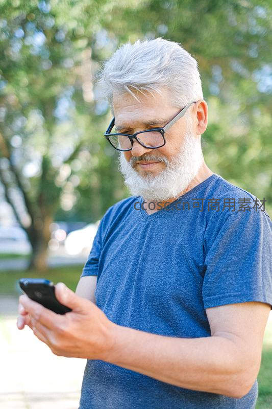一位戴着眼镜、留着白胡子的长者站在绿树成荫的公园里,低头专注地看着手中的智能手机,享受现代科技带来的便捷与乐趣。