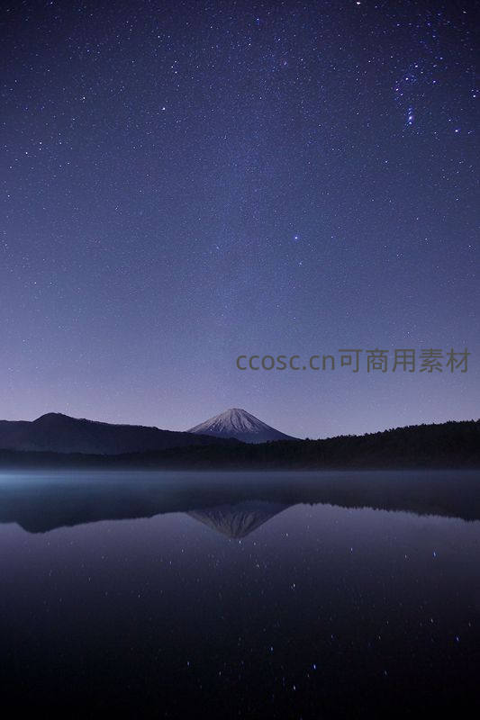 富士山在繁星点点的夜空下巍然耸立,湖面如镜完美倒映山形与星空,营造出梦幻而宁静的自然画卷。