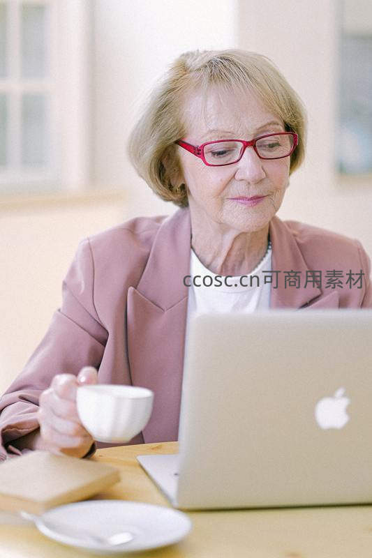 戴红框眼镜老妇边喝咖啡边用电脑