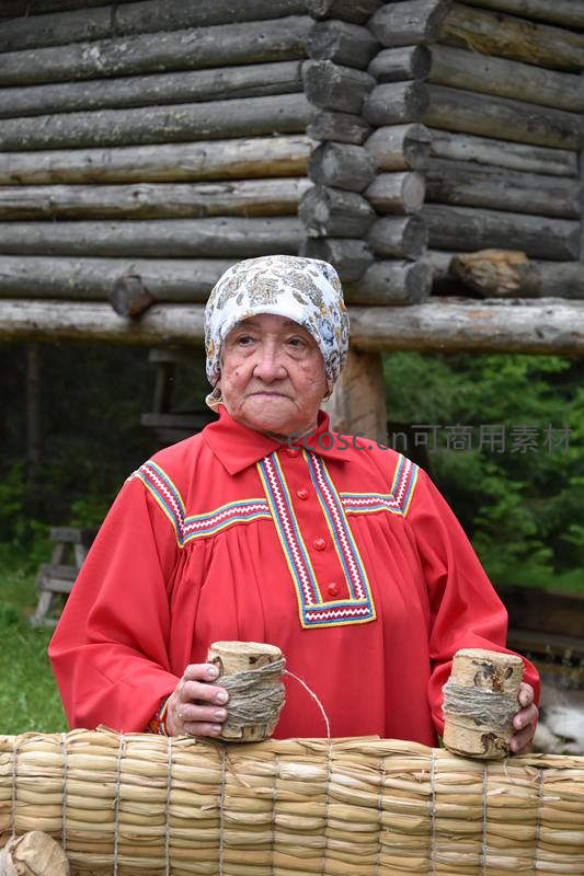 传统服饰老妇人持木杯,木屋前展现民俗风情