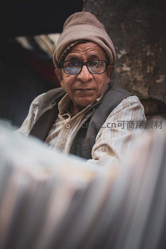 一位戴着针织帽和眼镜的年长男性,眼神深邃地望向镜头,脸上布满岁月的痕迹,背景模糊,突显其沉静与故事感。