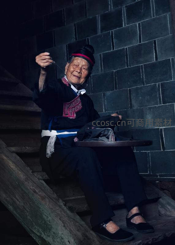 一位身着民族服饰的老奶奶坐在青砖墙边的木梯上,专注地缝制衣物,传统纹样与古老建筑相映成趣,展现慢生活的智慧。
