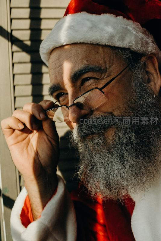圣诞老人扶镜浅笑,阳光洒落脸庞