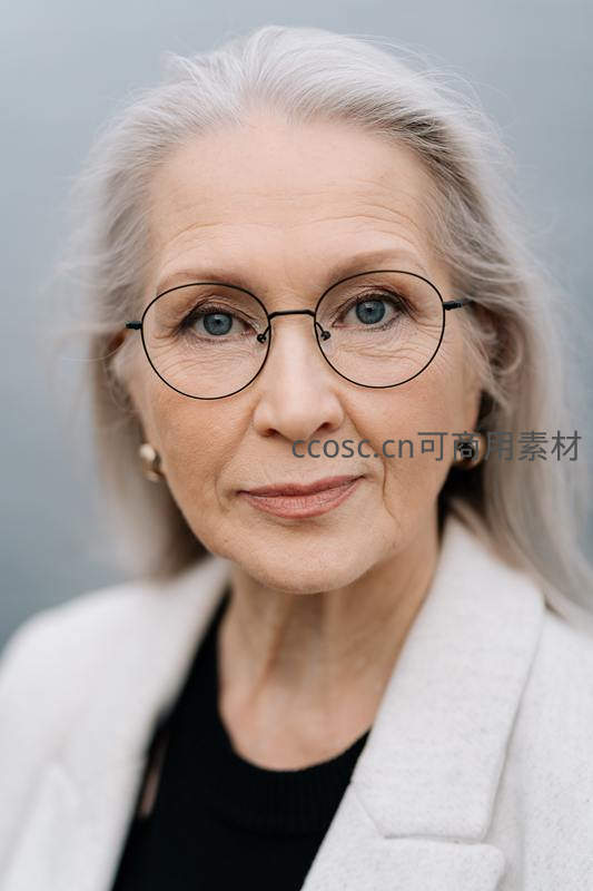 银发女士佩戴圆框眼镜,身穿白色外套,温柔注视镜头,面容平静而富有智慧,散发出成熟优雅的魅力。