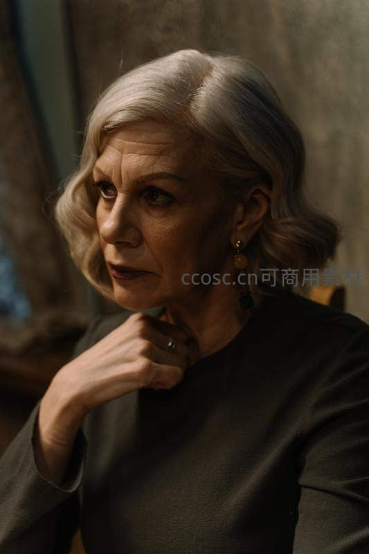 在暖色调灯光下,银发女士轻抚下巴陷入沉思,神情专注而内敛,营造出安静、有故事感的氛围。
