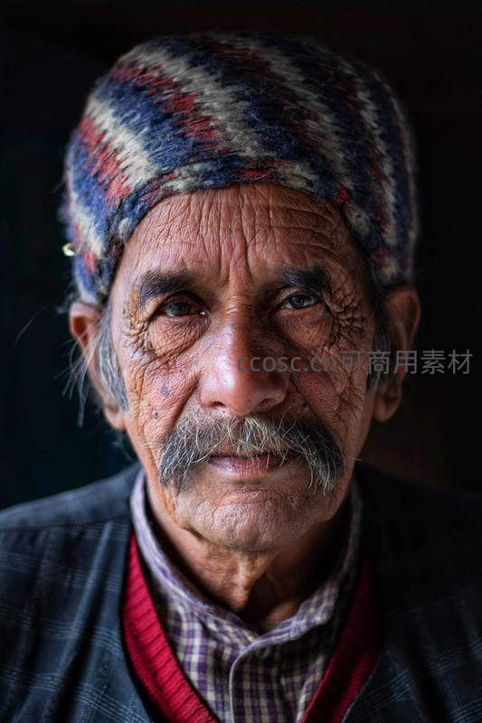 一位头戴彩色编织帽的老人直视镜头,深邃的眼神仿佛蕴含无数人生故事,面部沟壑纵横,光影对比强烈,突显其经历与尊严,极具视觉冲击力。