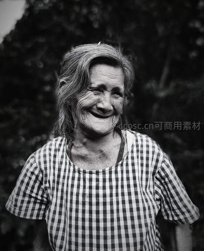 在户外自然光下,一位穿着经典格子衫的老妇人对着镜头露出温暖而慈祥的笑容,每一道皱纹都诉说着故事。