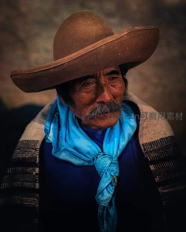 戴着宽边毡帽、系着鲜艳蓝巾的老人,目光沉静而深远,面部线条刚毅,展现出一种传统与岁月沉淀的力量。