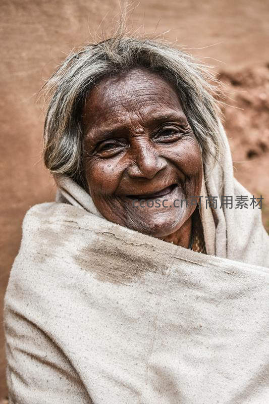 一位裹着浅色头巾的老年女性,在土黄色背景前展露纯真笑容,皮肤黝黑粗糙却充满生命力,传递出质朴的温暖。