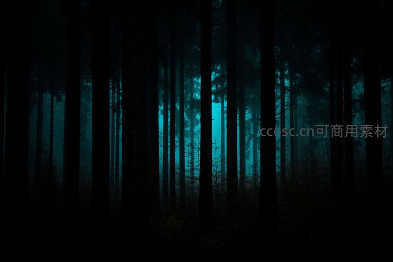 浓密的森林笼罩在黑暗之中,唯有远处透出一抹幽蓝光芒,雾气弥漫,营造出神秘、静谧甚至略带惊悚的奇幻氛围。