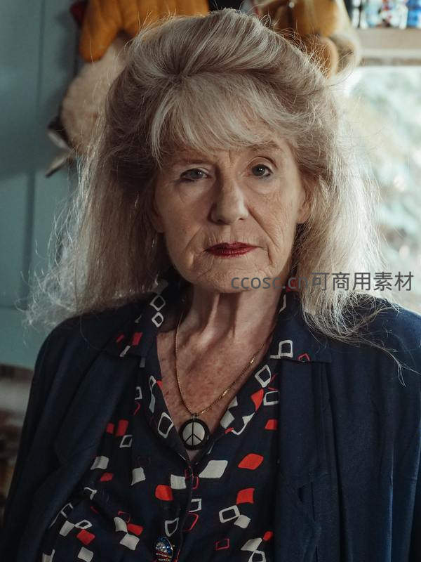 一位白发苍苍的老年女性直视镜头,脸上布满岁月的痕迹。她身穿带有几何图案的衬衫,佩戴着和平标志项链,神情平静而深邃。