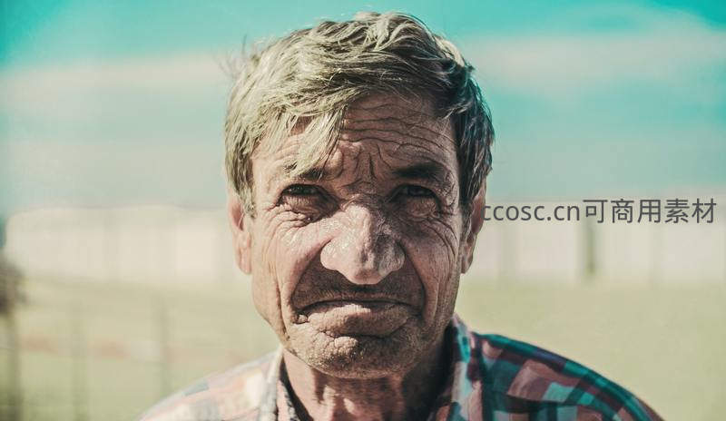 一位饱经风霜的老人,脸上布满深刻的皱纹,眼神中透露着生活的艰辛与坚韧。背景是明亮的天空,突显其沧桑面容。
