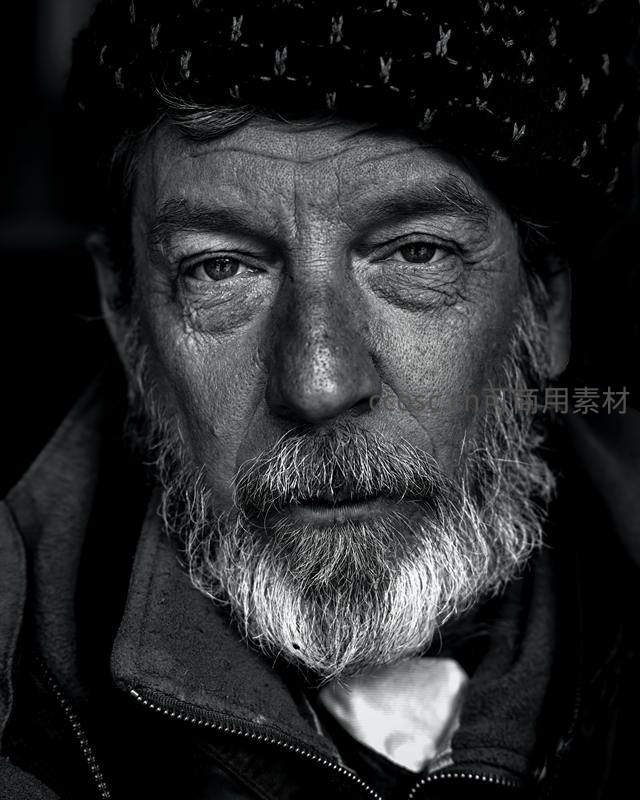 一张高对比度的黑白人像,聚焦于一位胡须花白的老者。他眼神深邃,仿佛在诉说一段漫长的人生故事,充满艺术感染力。