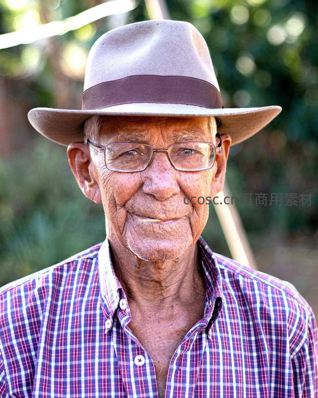 一位慈祥的老人戴着浅色帽子和眼镜,身穿红白格子衬衫,脸上布满岁月的痕迹,却带着温和的微笑,背景是模糊的绿色植物。