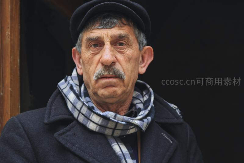 一位留着小胡子、戴着深色鸭舌帽和格纹围巾的老人,眼神深邃而严肃地凝视着镜头,充满故事感。