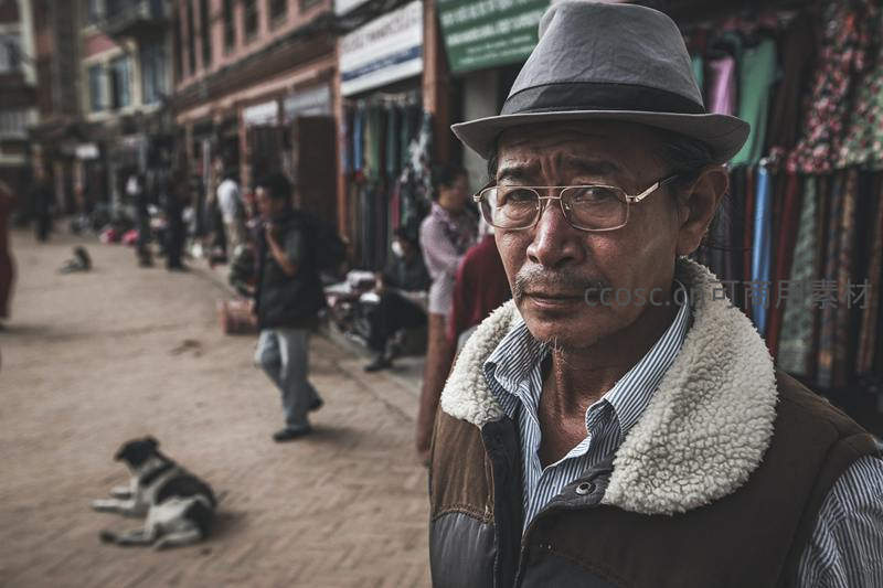 在熙攘的街头市场,一位戴着眼镜和灰色礼帽的老人侧身回望,眼神深邃,背景是模糊的商贩与行人。