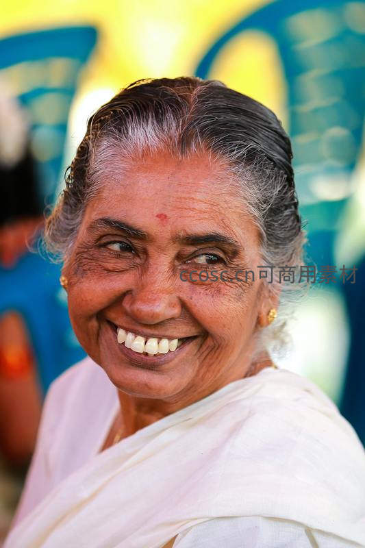 印度老妇人露出洁白牙齿开怀大笑,脸上沟壑是岁月的印记,笑容中洋溢着纯粹的喜悦与生命的活力。