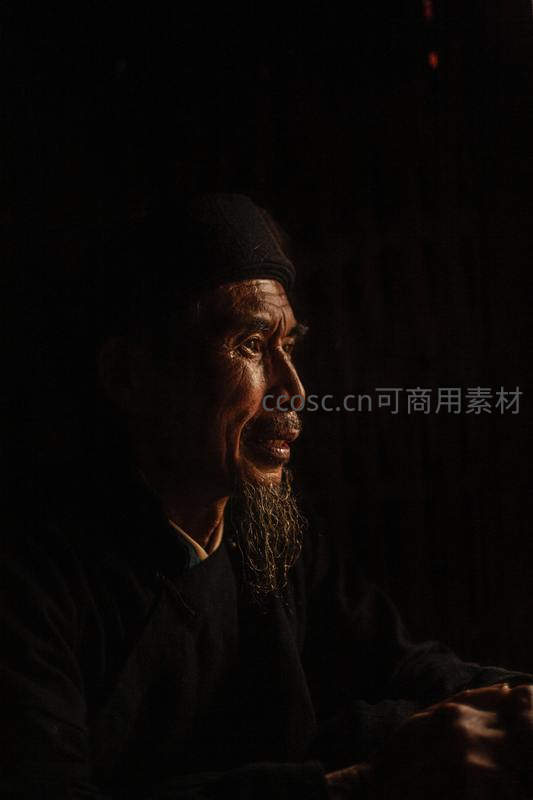 一束微光勾勒出老人沉静的侧脸轮廓,深邃的阴影中,他仿佛正凝视远方,沉浸在无言的思绪与回忆里。