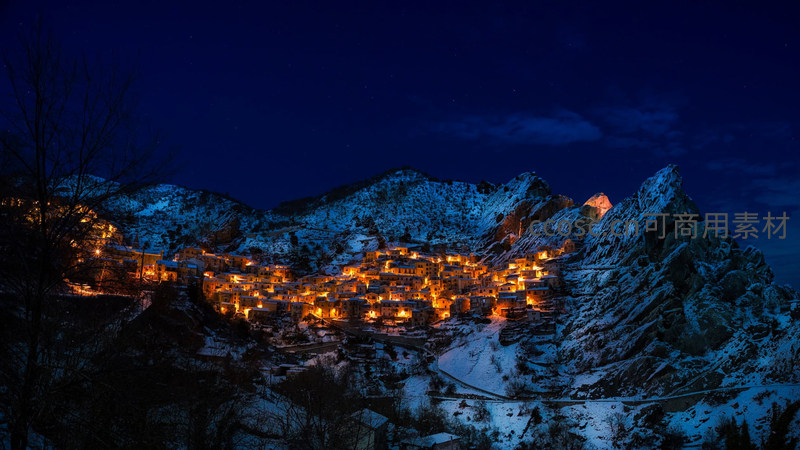 被白雪覆盖的山村在夜幕中亮起温暖灯光,依偎在巍峨山峦之间,宛如童话世界,宁静而温馨。