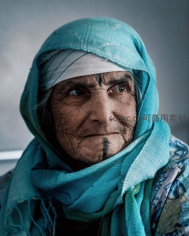 一位头戴蓝色头巾、面部带有传统纹饰的老妇人,眼神深邃而凝重,展现了古老文化的印记和岁月赋予的坚韧神态。