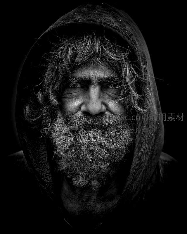 在纯黑背景下,一位戴着兜帽、留着浓密胡须的老者面容清晰,强烈的明暗对比突显其坚毅神情与岁月沉淀的厚重感。