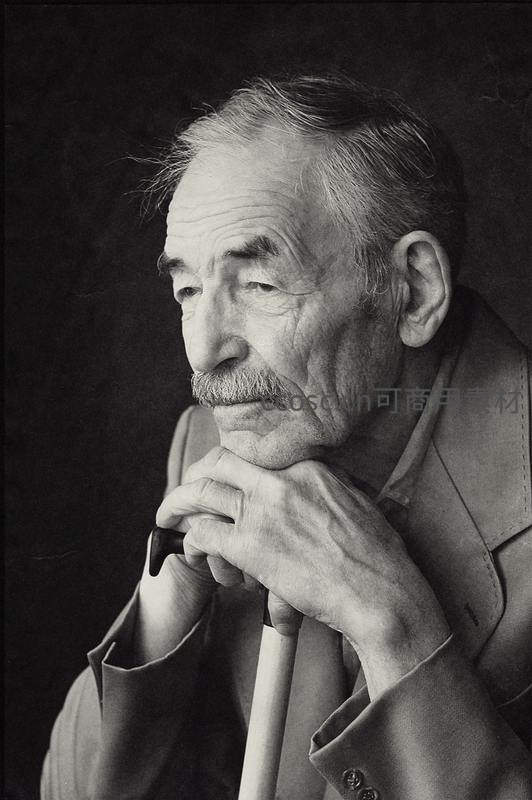 黑白照片中,一位留着小胡子的老人以拐杖支撑下巴,侧脸凝视远方,神情专注而内敛,仿佛在思考人生或回忆过往的智慧长者。