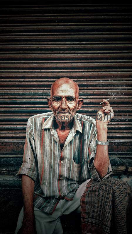 一位光头老者坐在锈迹斑斑的卷帘门前,手持香烟,神情凝重,背景是城市的老旧角落,诉说着平凡人生中的沉默与思考。