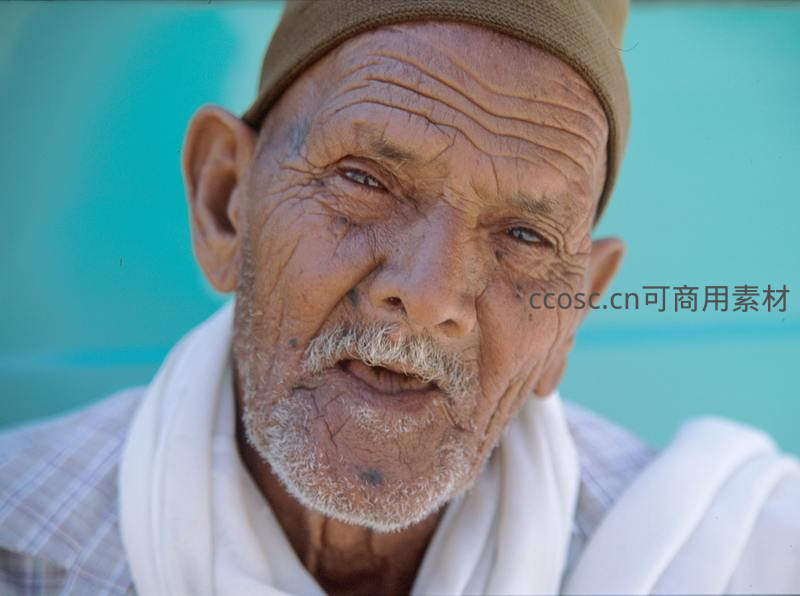 一位面容布满皱纹的老者戴着棕色帽子,身披白巾,在蓝色背景前凝视镜头,神情沉静,充满故事感。