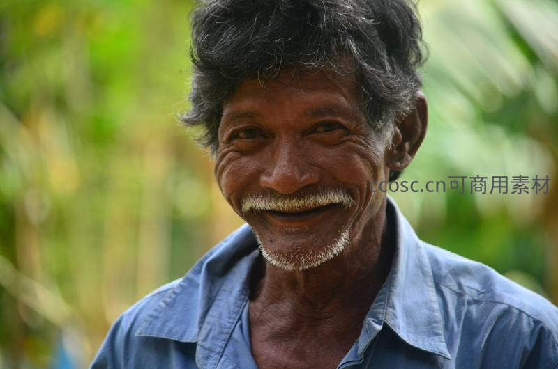 一位留着花白胡须的男子在绿意盎然的背景下开心微笑,阳光洒在他的脸上,展现出自然与生命的活力。