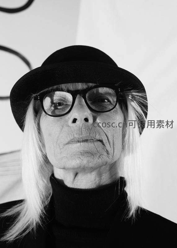 一张黑白肖像照,一位戴黑帽和大框眼镜的长者直视镜头,神情严肃而富有艺术感,彰显个性与时尚品味。