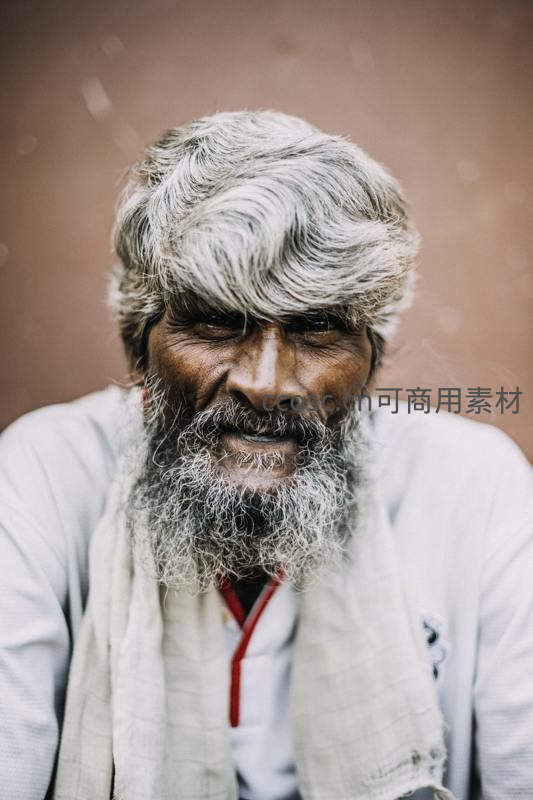一位拥有浓密银白色长胡须的老者,面带温和微笑,眼神慈祥,身披浅色围巾,展现出历经沧桑后的从容与宁静。