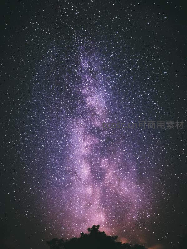 绚丽的紫粉色银河如拱桥般跨越天际,树梢剪影衬托其梦幻色彩,营造出宁静而神秘的夜空景象。